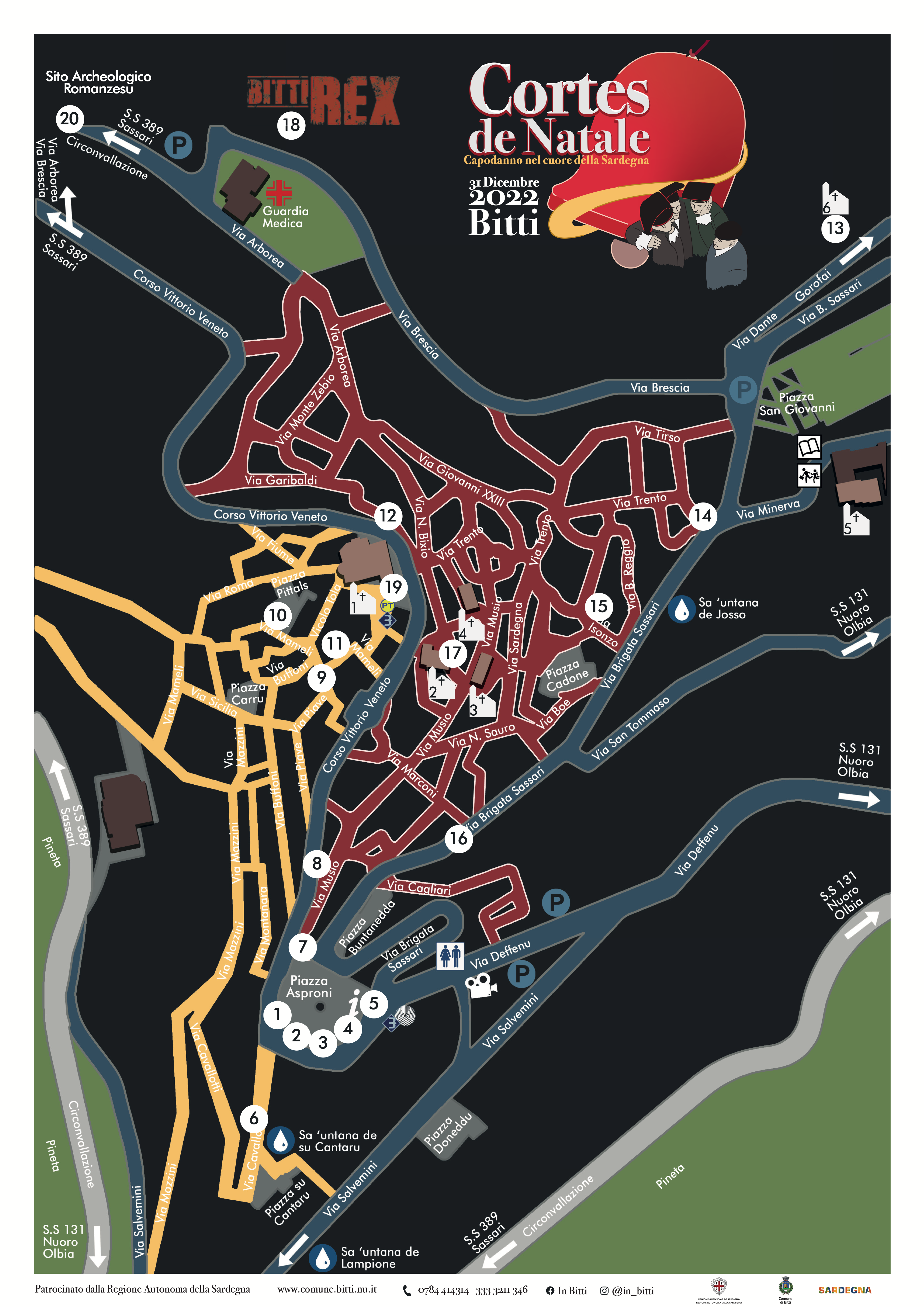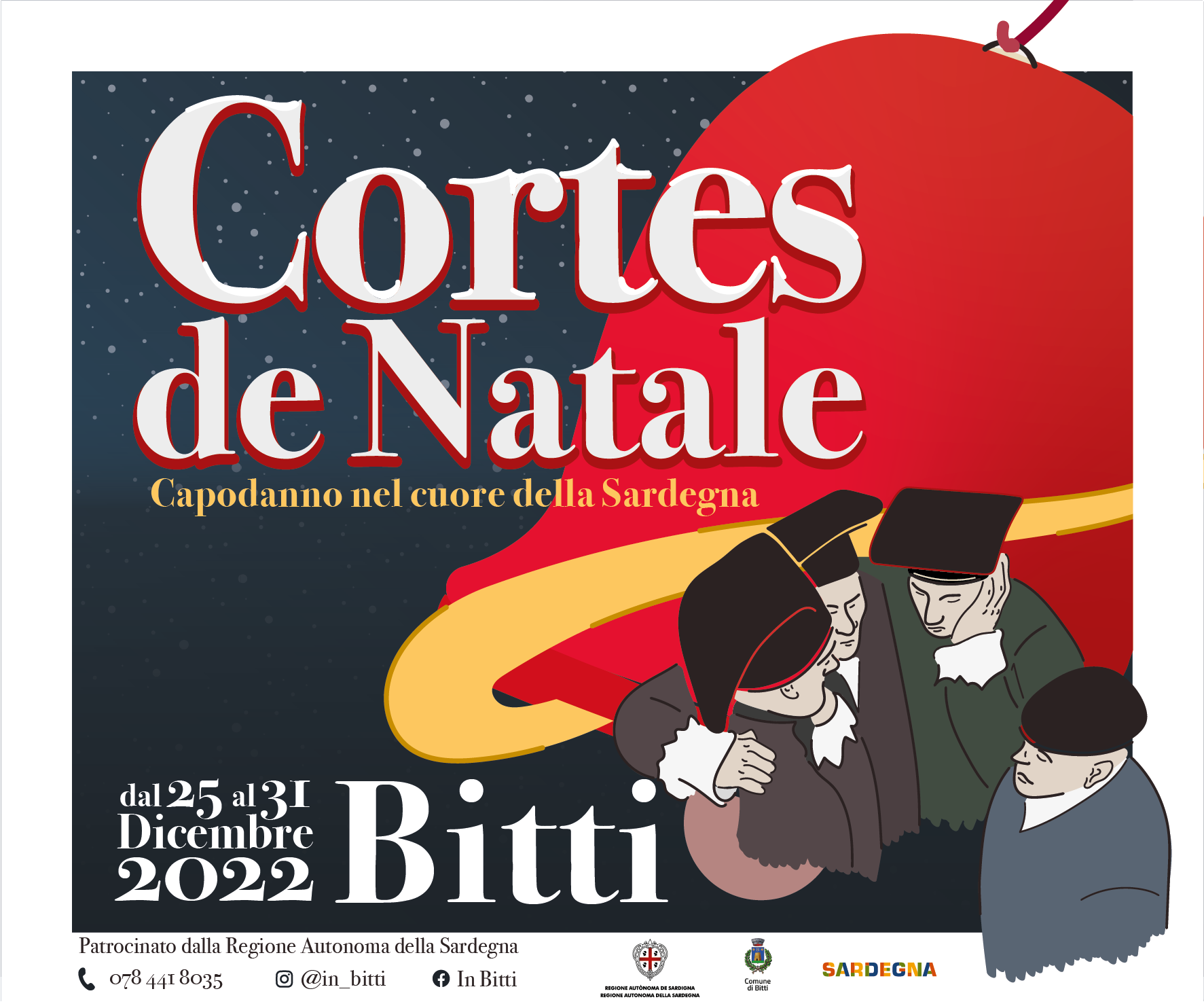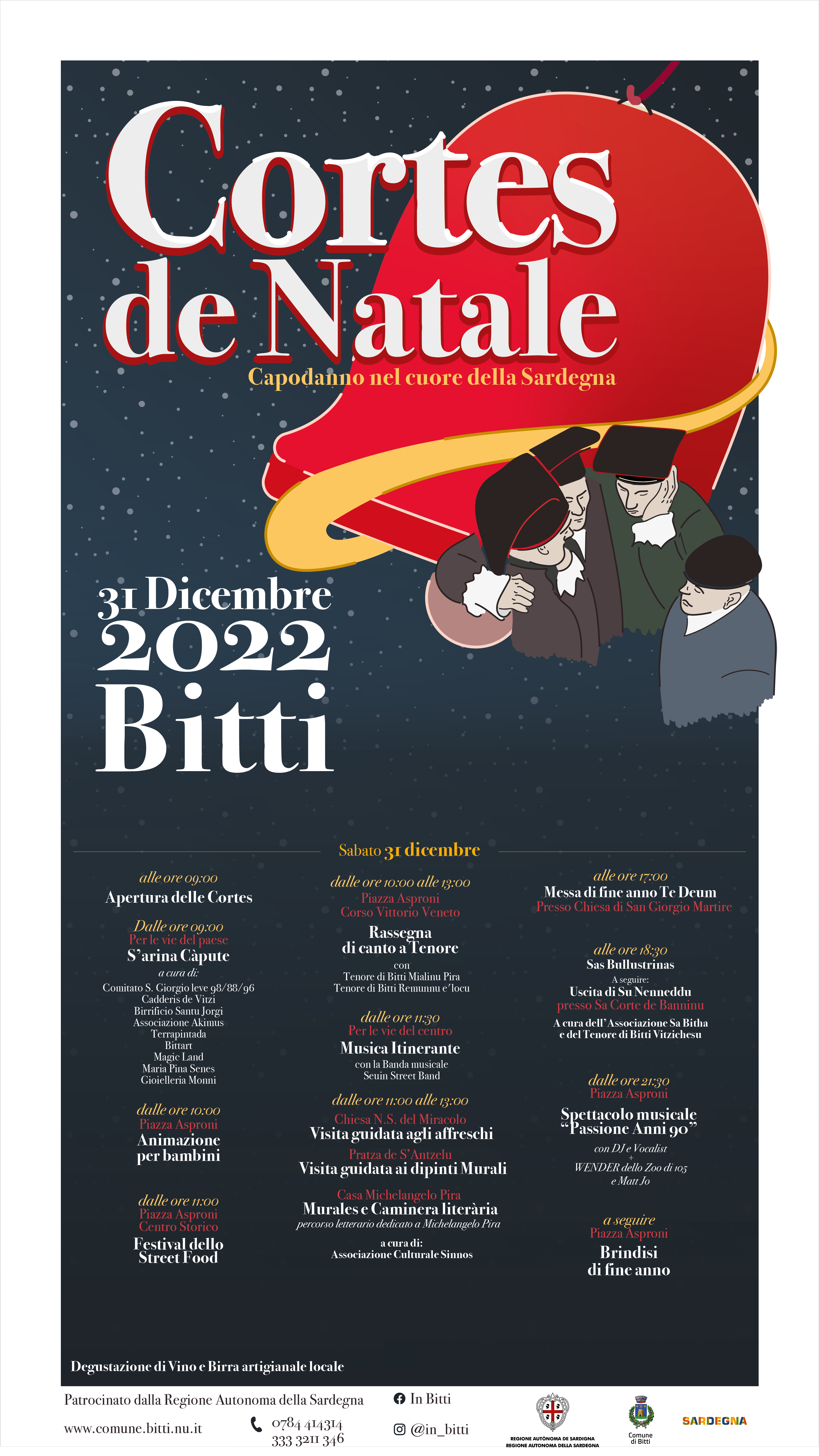 Per questo progetto, ho sviluppato un poster e un branding che unisse lo spirito di Cortes Apertas con l’atmosfera festiva del Natale. Ho progettato uno sfondo innevato e stilizzato i Tenores di Bitti, posizionandoli davanti a una grande campana di Natale rossa per enfatizzare il tema natalizio. Il poster è stato progettato per integrare perfettamente il programma dell’evento, fornendo un’identità visiva chiara e coesa.