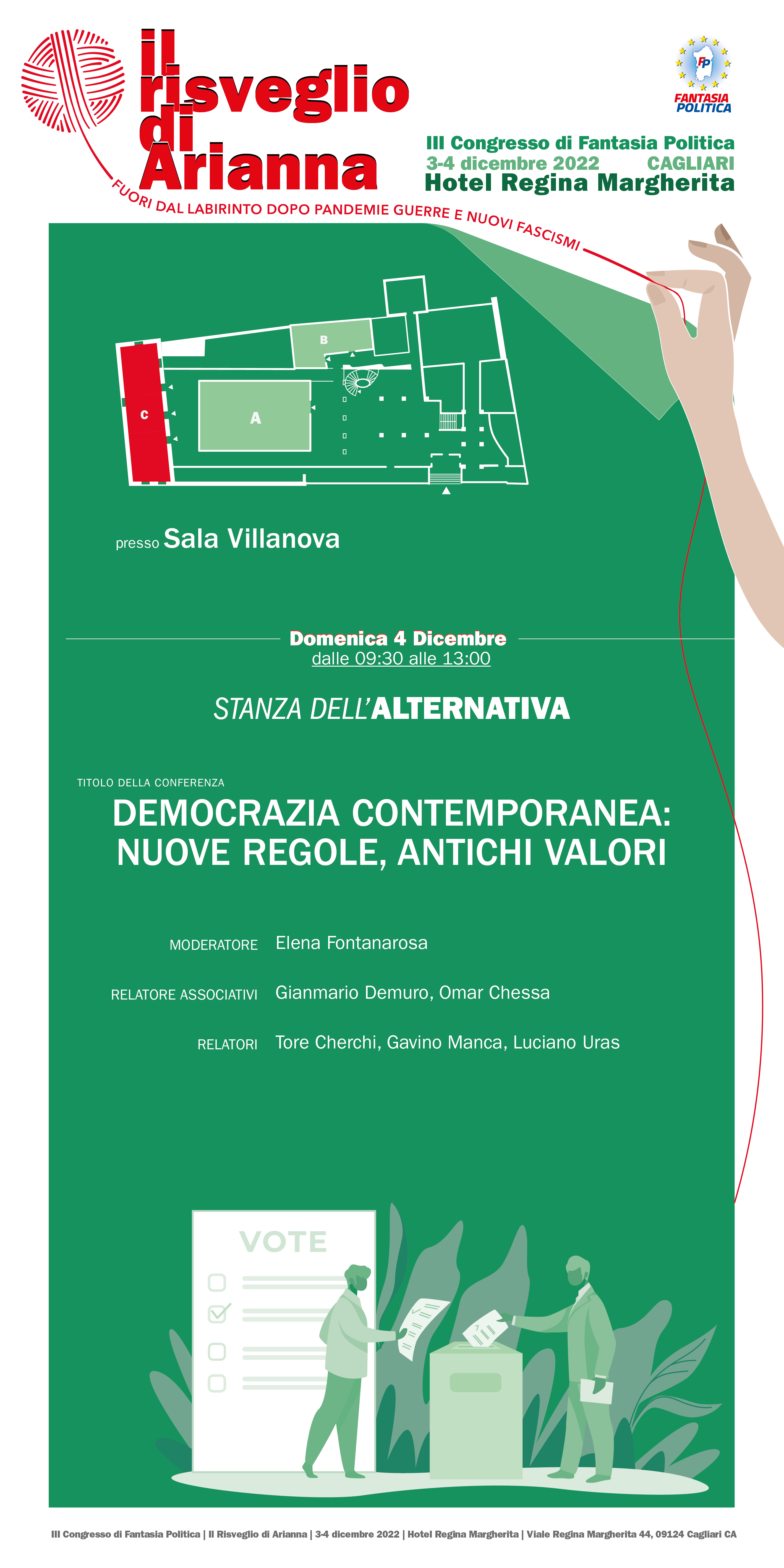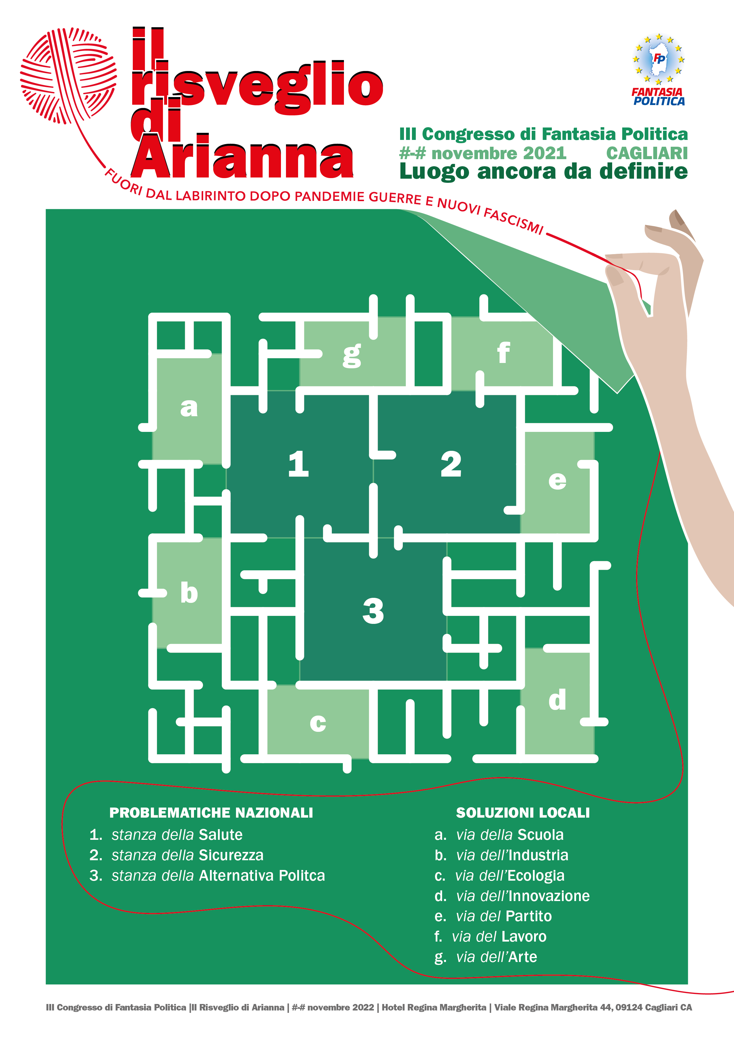 Nel 2021, ho sviluppato il design del poster che ha rappresentato il volto del congresso. Il design era pulito e informativo, catturando l’essenza dell’evento. Per l’edizione 2022, intitolata Il Risveglio di Arianna, ho adottato un approccio diverso, creando un logo autonomo ispirato al mitologico filo di Arianna. Il poster rappresentava una mano delicata che srotola un gomitolo di filo, simboleggiando la ricerca di soluzioni nel labirinto delle pandemie, delle guerre e dell’aumento del fascismo.